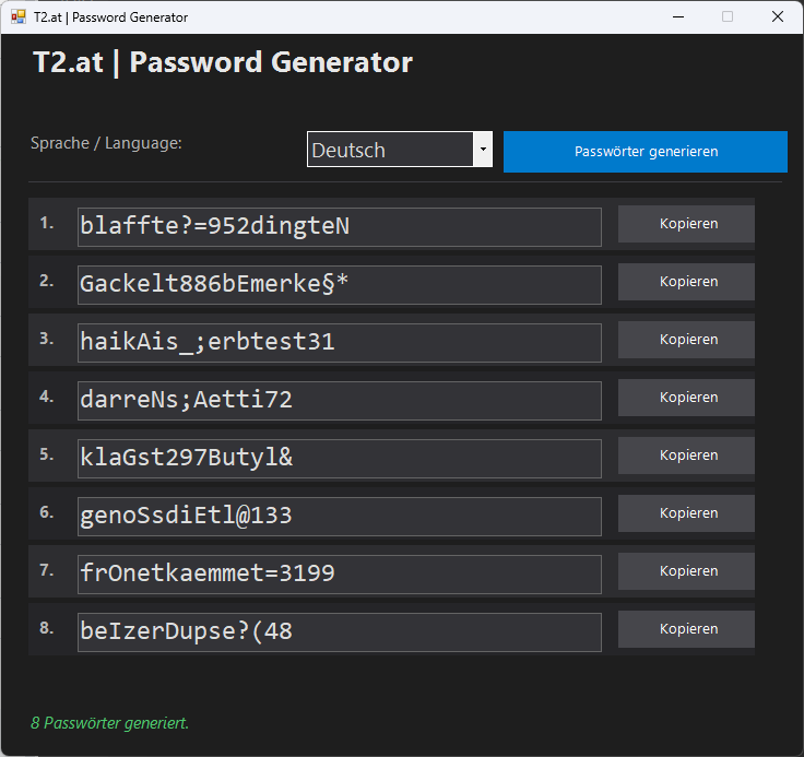 Das Tool erzeugt auf Knopfdruck mehrere Passwort-VorschlĂ€ge gleichzeitig, aus denen Sie das passende auswĂ€hlen können. Mit dem âKopieren"-Button neben jedem Passwort ĂŒbernehmen Sie es direkt in die Zwischenablage â fertig.